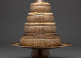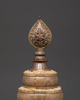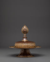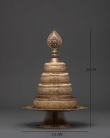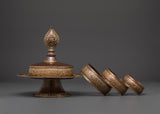 This offering set, which measures 30 centimeters in height and weighs 0.65 kilograms, was expertly crafted from a copper body with beautiful bronze decoration. Its tiered shape is adorned with artificial coral stones, which represent energy, sacred intent, and spiritual abundance. The broad 19-centimeter base provides stability for altar use, while the complex finial at the top embodies sacred symbols from Tibetan Buddhist tradition.