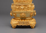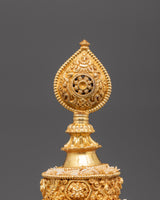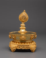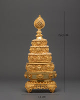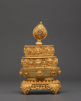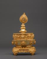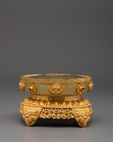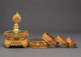 Crafted by expert artisans, the set has beautiful carvings and stacked rings that represent the galaxy. This Buddhist Mandala Set, with its graceful form and detailed gold-plated motifs, complements any altar setting and serves as a perfect tool for offerings, prayers, and meditation. Its size and weight lend it presence and stability, while its detailed craftsmanship reflects the mandala's deep symbolism as a spiritual tool.