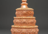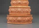 The intricate craftsmanship exemplifies traditional Tibetan artistry, with beautiful floral and geometric patterns on each layer. Each layer is intended to house grains, jewels, or symbolic gifts, making it an essential tool for daily rituals, initiations, and meditation activities. The copper body enhances its spiritual energy, ensuring it radiates sanctity during ceremonies and remains a cherished piece in any home altar or temple setting.