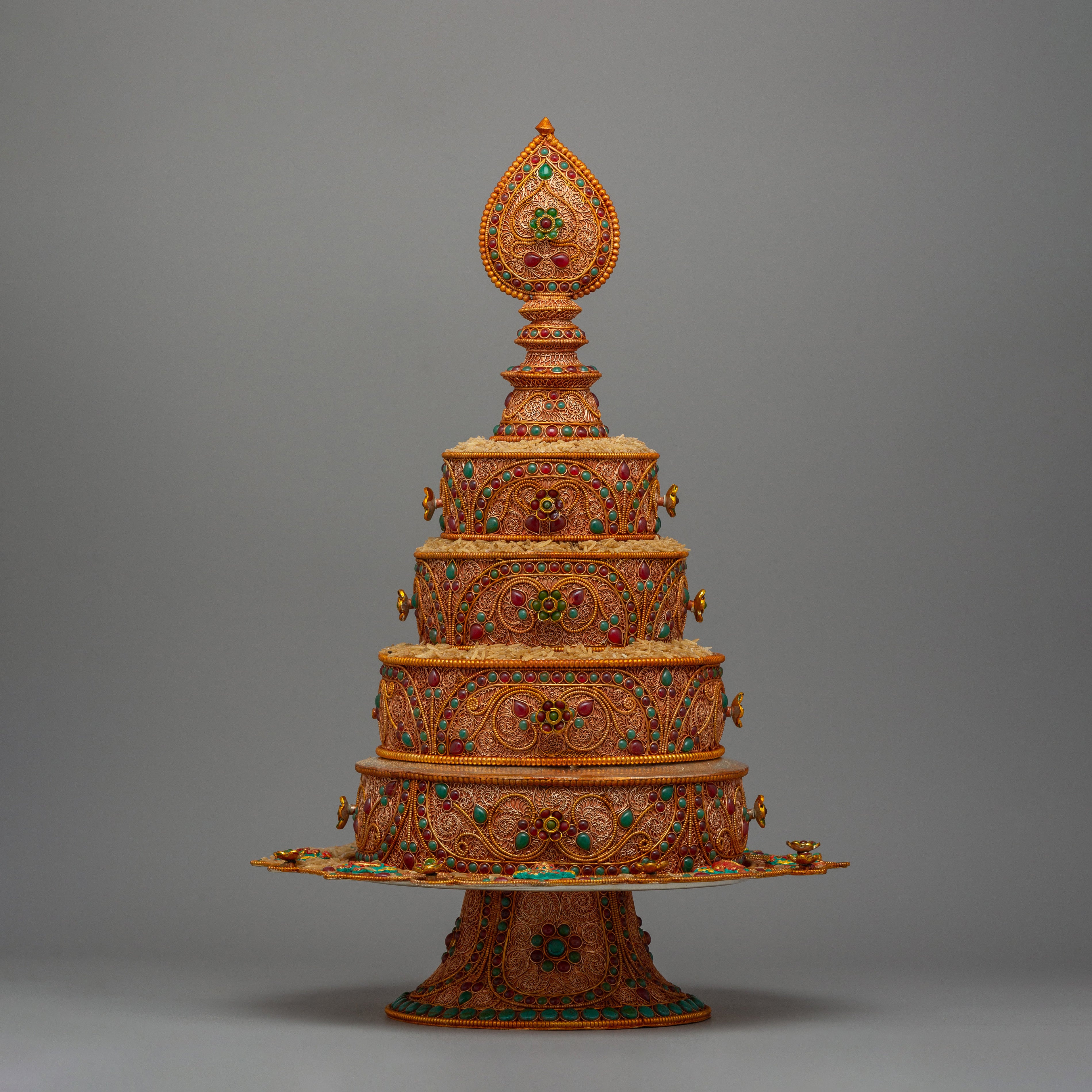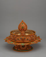In addition to its visual appeal, this ritual mandala set is a profoundly symbolic object utilized in Tibetan Buddhist rituals to depict the universe's sacred, interrelated energies. The tiered design evokes the holy mountain, representing the spiritual journey to enlightenment. The mandala's brilliant colors, complex stone inlays, and filigree details represent the artistry and craftsmanship that created this piece as both a devotional tool and a spiritual artifact suited for rituals and practices designed to invoke divine presence and benefits.