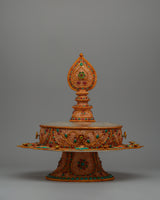 The Ritual Mandala Set featured here is an excellent piece of Tibetan art. It measures 46 cm tall and 31 cm wide and is precisely plated with copper and silver, creating an attractive and lasting base. The mandala, built in a tiered, circular shape, is embellished with several levels depicting the universe's sacred structure in Tibetan cosmology. A delicate spire above the central pinnacle completes the piece's spiritual design.