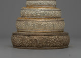 The Buddhist Mandala Offering Set is a finely designed assortment that is expertly crafted from a copper body and tastefully electroplated in silver. This collection is a must-have for any altar or meditation area since it reflects the rich traditions of Buddhist spirituality. The offering set's overall beauty is raised by the electro silver plating, which not only improves the visual appeal but also gives a glossy surface that brilliantly reflects light.
