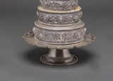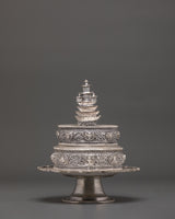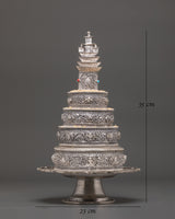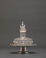 Every aspect of this mandala offering set exemplifies Tibetan artistry and craftsmanship, making it both a valuable spiritual tool and a stunning display piece. Its elaborate carvings and meticulously arranged stones evoke ancient symbolism for meditation, blessings, and offerings. The 1.74kg weight of this sacred item lends it a grounded presence, making it great for strengthening meditation techniques, spiritual ceremonies, and mindfulness. This Tibetan Buddhist Mandala Offering Set will enhance the appearance of your meditation room, yoga studio, or temple. This mandala symbolizes the rich cultural heritage of Himalayan artwork, making it suitable for practitioners, collectors, and spiritual enthusiasts alike. Use this silver-plated mandala to promote peace, attract positive energy, and create a sacred space for spiritual development, prayer, and devotion.