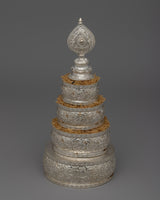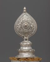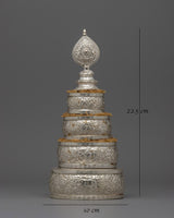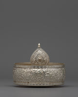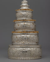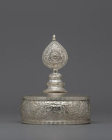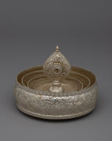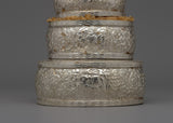 The exquisitely designed Silver Mandala Offering Set is expertly constructed from a copper body and is silver-plated. This 22.5 cm tall offering set is a magnificent illustration of traditional workmanship with profound spiritual meaning. In Buddhist rituals, mandalas—complex patterns that portray the universe—are utilized to make symbolic gifts to the deities, and this offering set symbolizes the cosmos during those rites.