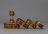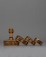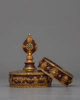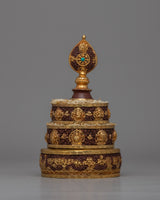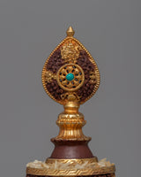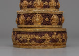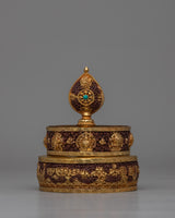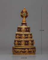 This Traditional Buddhist Copper Mandala is a stunning work of spiritual art, made from an oxidized copper body, gold-plated for a dazzling finish, and inlaid with vibrant turquoise artificial stones. With a height of 21 cm, a width of 10.5 cm, and a weight of 0.364 kg, this mandala is both small and solid, making it ideal for use on altars, meditation areas, or sacred shrines. The mandala, which is traditionally used in Himalayan Buddhism, represents the universe and is an effective instrument for meditation, spiritual practice, and enlightenment.