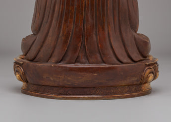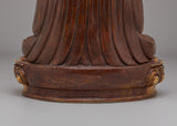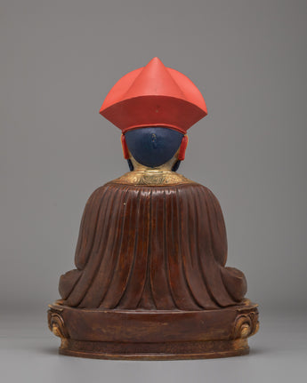 The Guru Shapdum Statue: The Buddhist Master is an exquisite representation of a revered Buddhist master, crafted to reflect the profound wisdom and spiritual authority of Guru Shapdum. This stunning statue stands 34.5cm tall and is made of copper, beautifully plated with 24K gold and meticulously painted with acrylics to bring life to every intricate detail. The vibrant red hat and blue beard create a striking contrast, adding depth and character to this remarkable sculpture. The attention to detail in the clothing, posture, and accessories enhances its significance as a symbol of spiritual mastery and enlightenment.