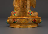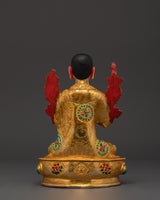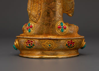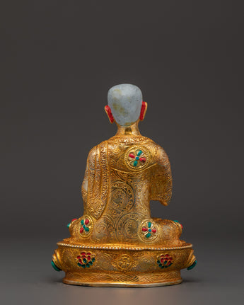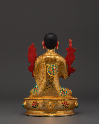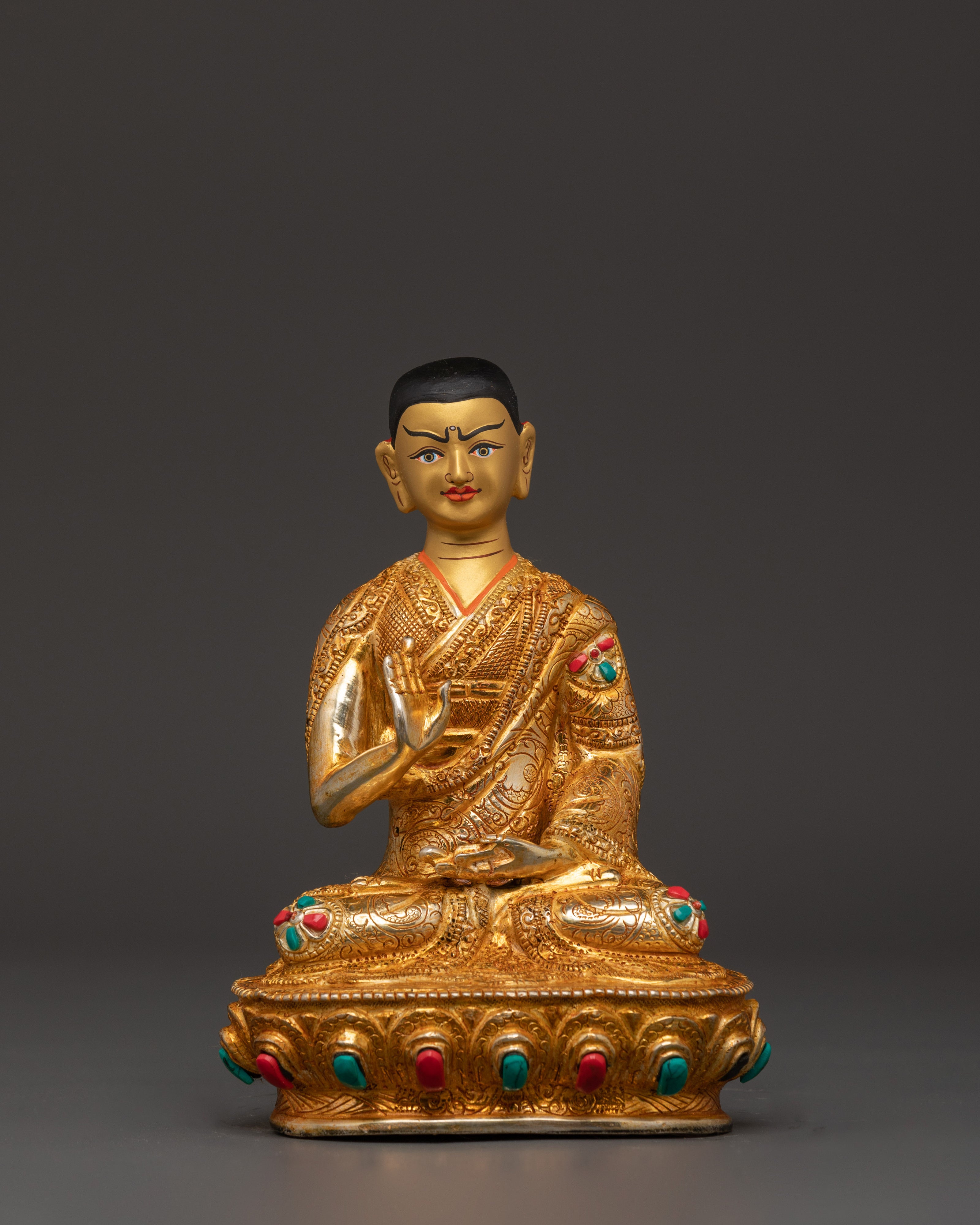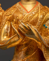 Each statue embodies the essence of the individual master's teachings, with Tsongkhapa represented in the vajra pose, his hand in the dharmachakra mudra. Je Khedrup is depicted with a sympathetic expression, carrying the wisdom of his teachings near to his heart, whilst Je Gyaltsab is seen in a tranquil but dignified position, exhibiting the attributes of a true Buddhist scholar and practitioner. The gold-plated copper finish gives depth and richness to the statues, while the acrylic color increases their visual appeal, making them both spiritually significant and artistically engaging.