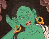 Milarepa Buddha, Tibet's most renowned and accomplished Buddhist master, is shown here. He is pictured seated on animal skins in mountain caves, meditating between the cooking pot and a lovely deer. In a listening gesture, his right hand is lifted to his right ear while his left hand holds a skull cup. The cave is surrounded by beautiful green trees and clouds, which gives the practitioner a pleasant vibe.