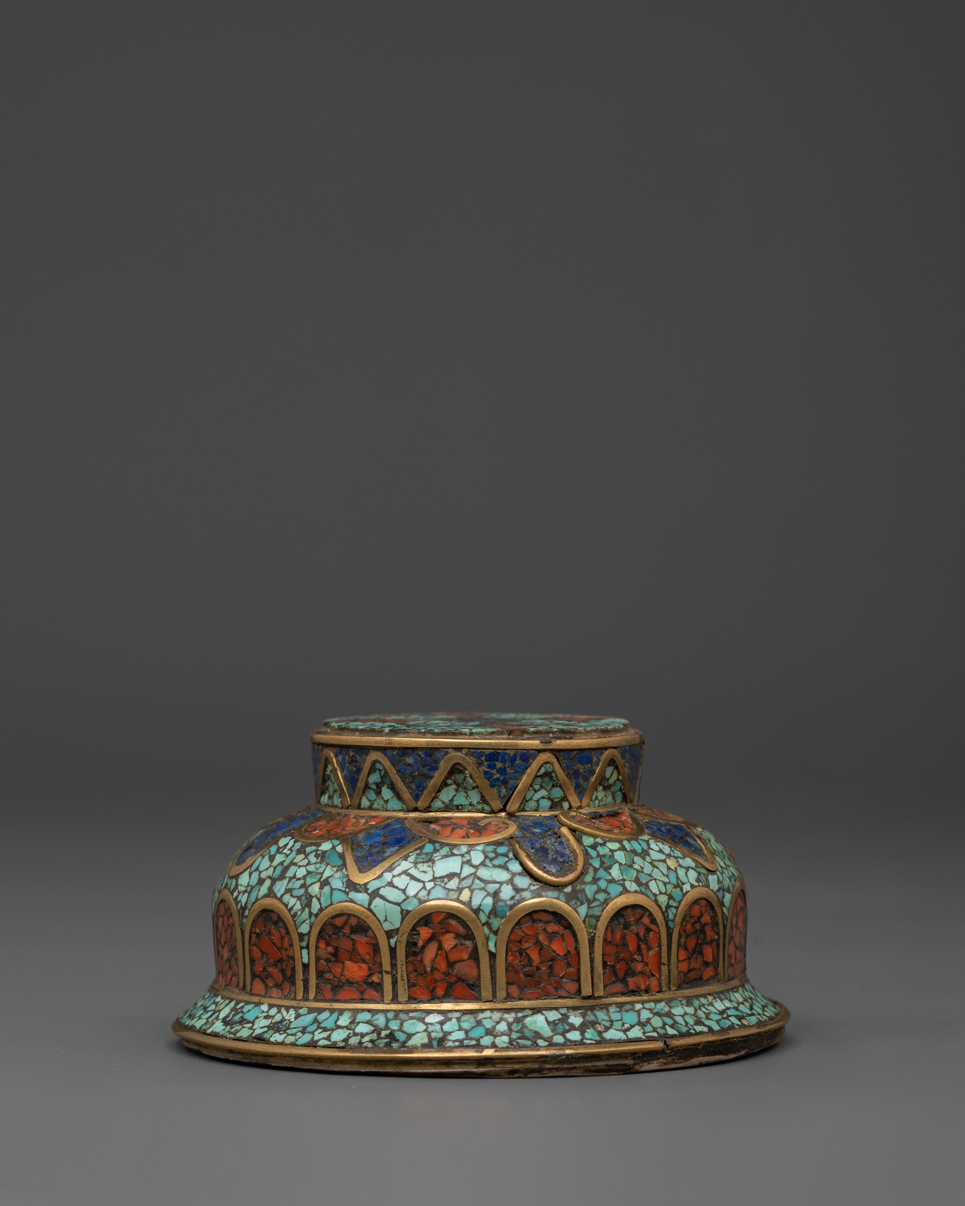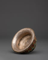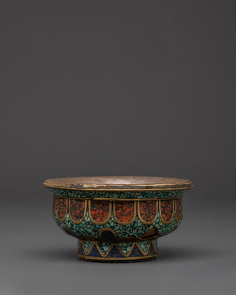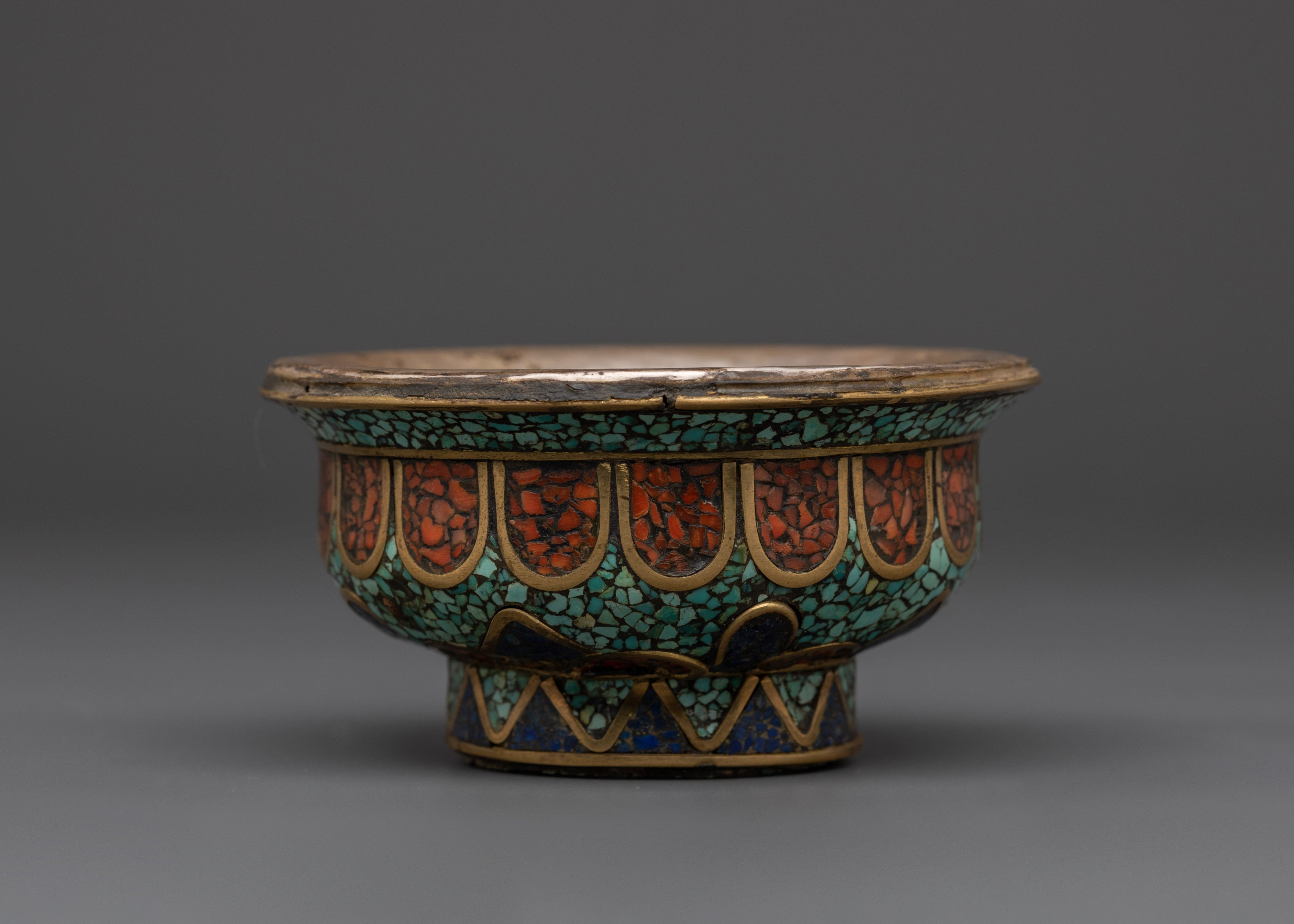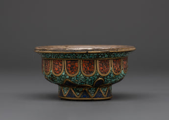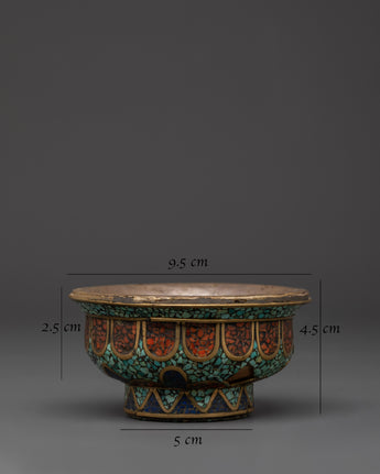 Made from copper, the bowl is both functional and decorative. The stone inlays add spiritual significance: lapis lazuli symbolizes wisdom and clarity, turquoise provides protection and healing, and coral attracts positive energy and prosperity. Lightweight at 0.13kg, this offering bowl is perfect for personal altars, meditation spaces, or as a meaningful gift for practitioners of Tibetan rituals.