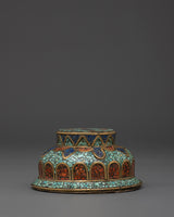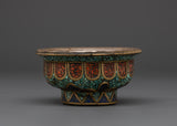 This Copper Offering Bowl is a beautifully handcrafted Tibetan ritual item, featuring inlaid lapis lazuli, turquoise, and coral stones. Measuring 45cm in height with a diameter of 10.5cm (top) and 9.5cm (base), and an inner depth of 2.5cm, this bowl is ideal for holding offerings such as water, flowers, or grains during spiritual practices.
