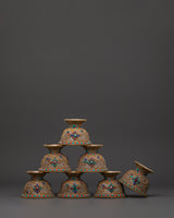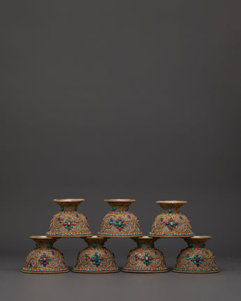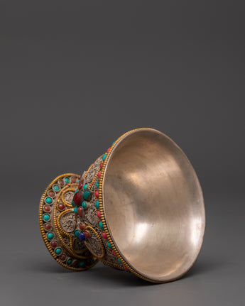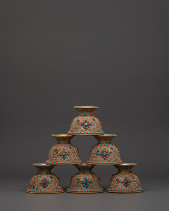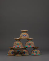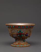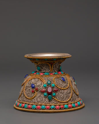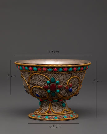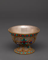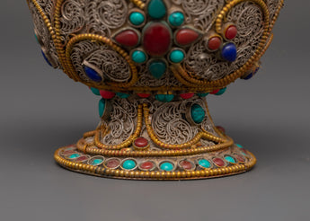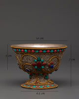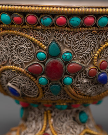 Master artisans create each offering bowl using age-old Himalayan techniques, engraving complicated floral patterns into the copper before plating and putting the stones. The filigree designs represent the interconnected nature of giving and dedication, while turquoise and coral add protective energy to ritual gifts, increasing visual beauty and spiritual significance.
