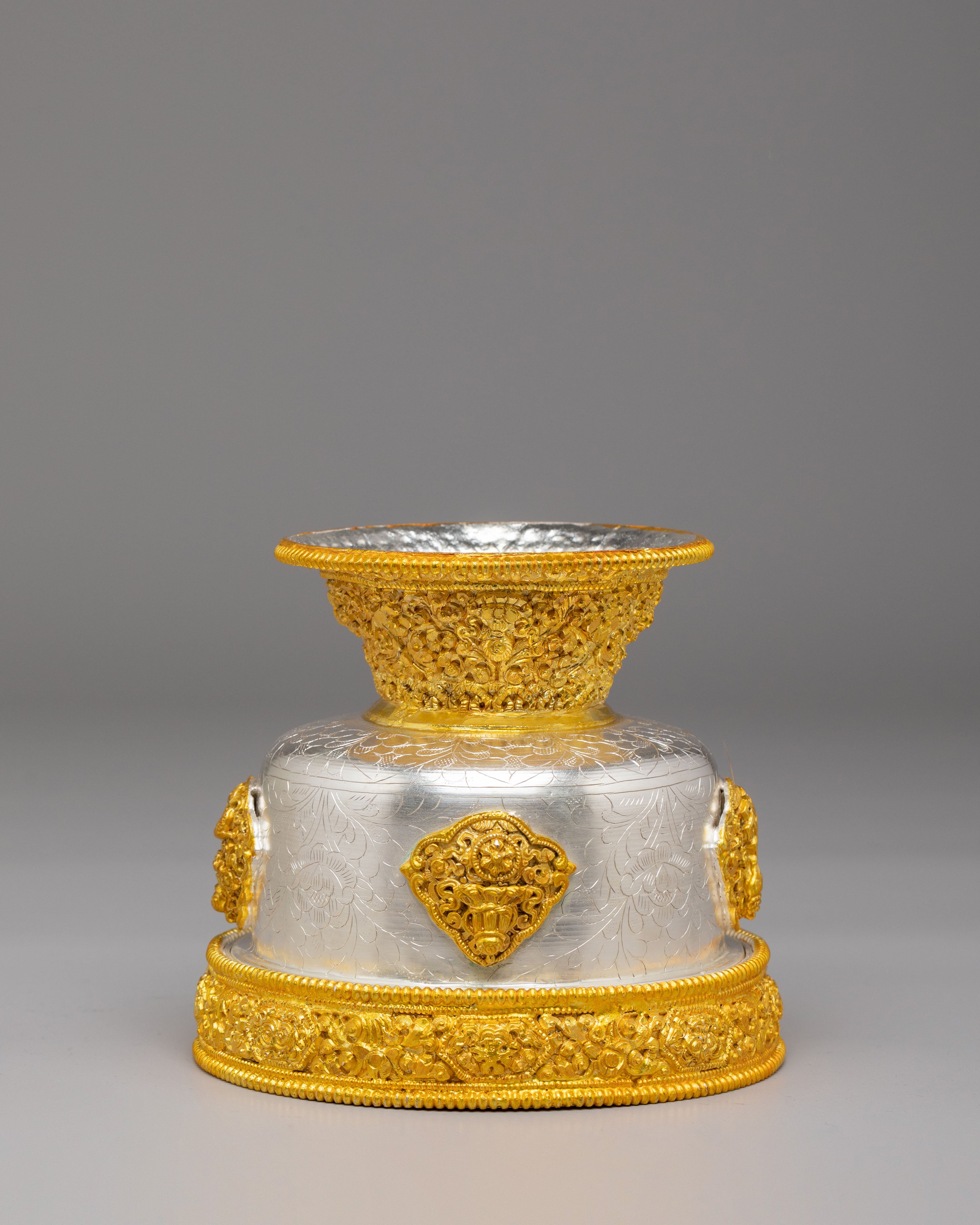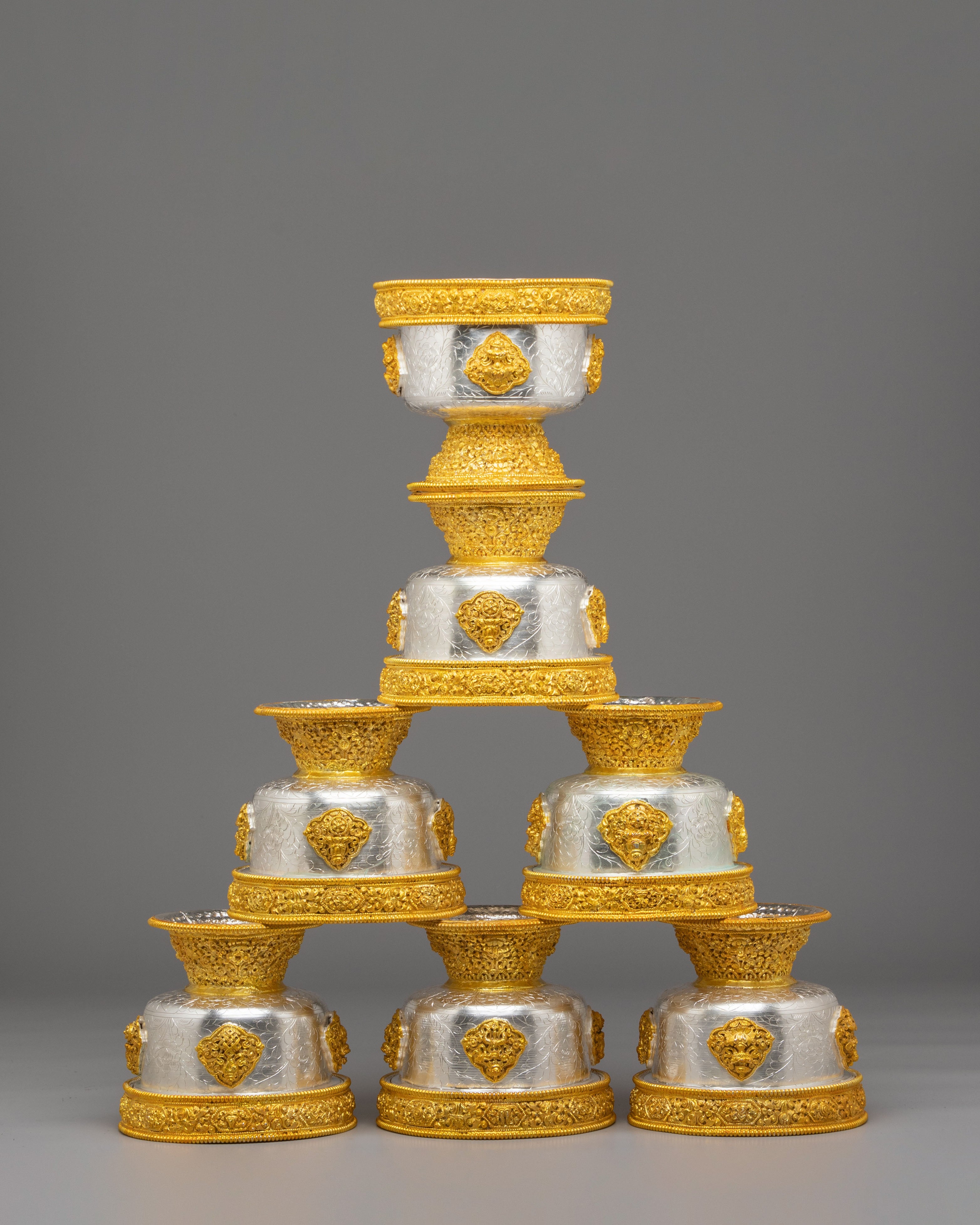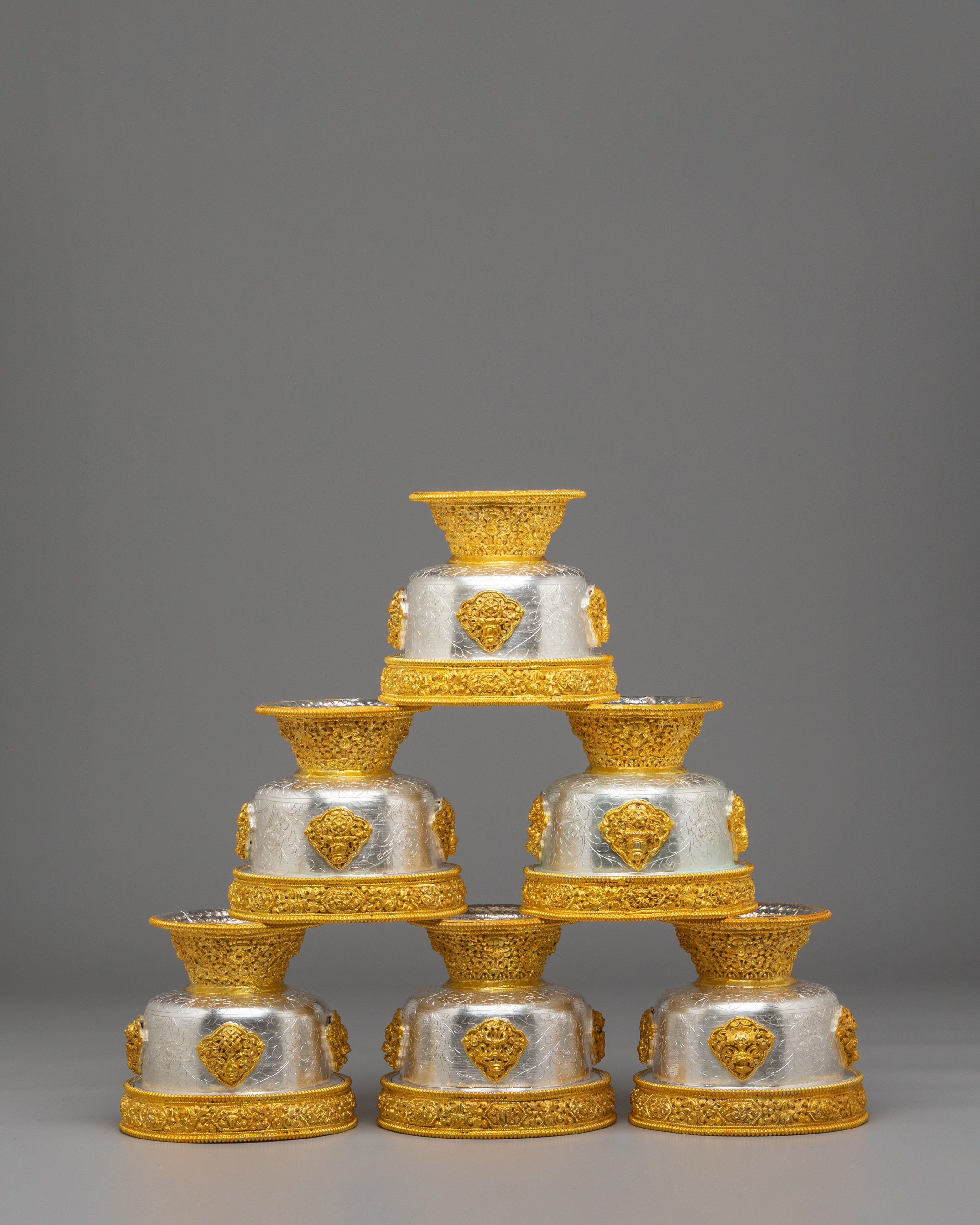 These bowls feature gold and silver plating that enhances their aesthetic beauty, giving them a refined and spiritual appearance. The engraved patterns on the bowls reflect Buddhist motifs, symbolizing abundance, generosity, and devotion. The gold and silver finishes shine with radiant elegance, adding depth to the bowls and creating a meaningful connection to the sacred act of offering and giving.