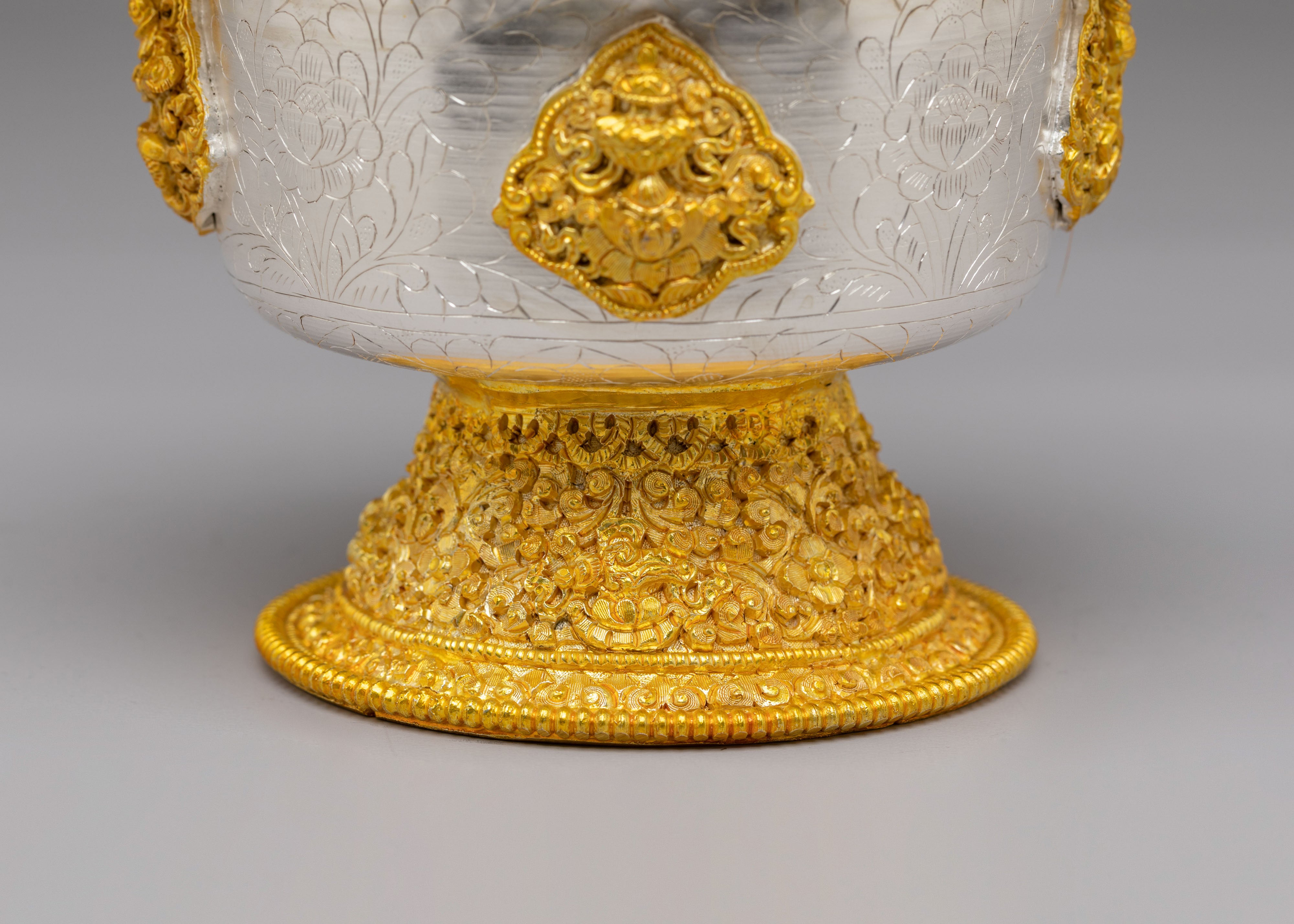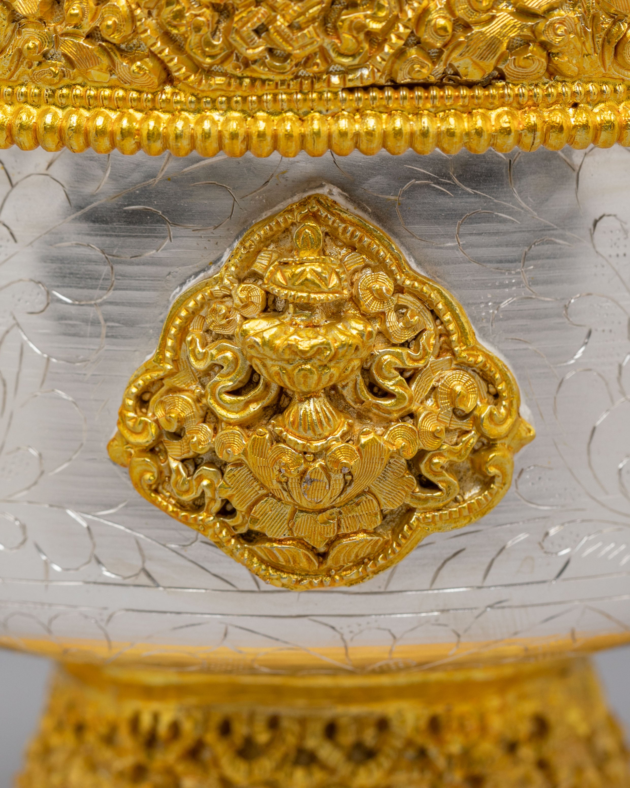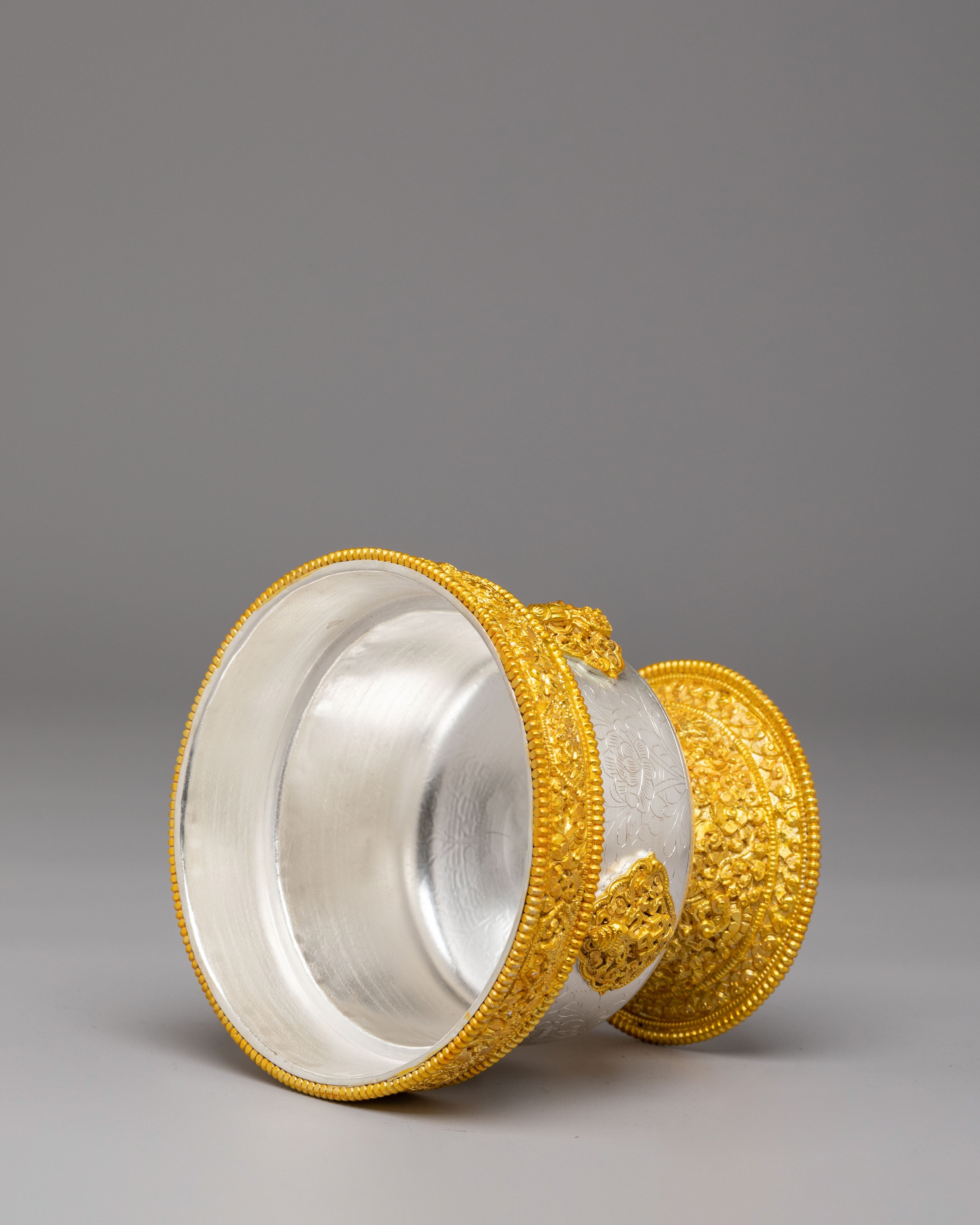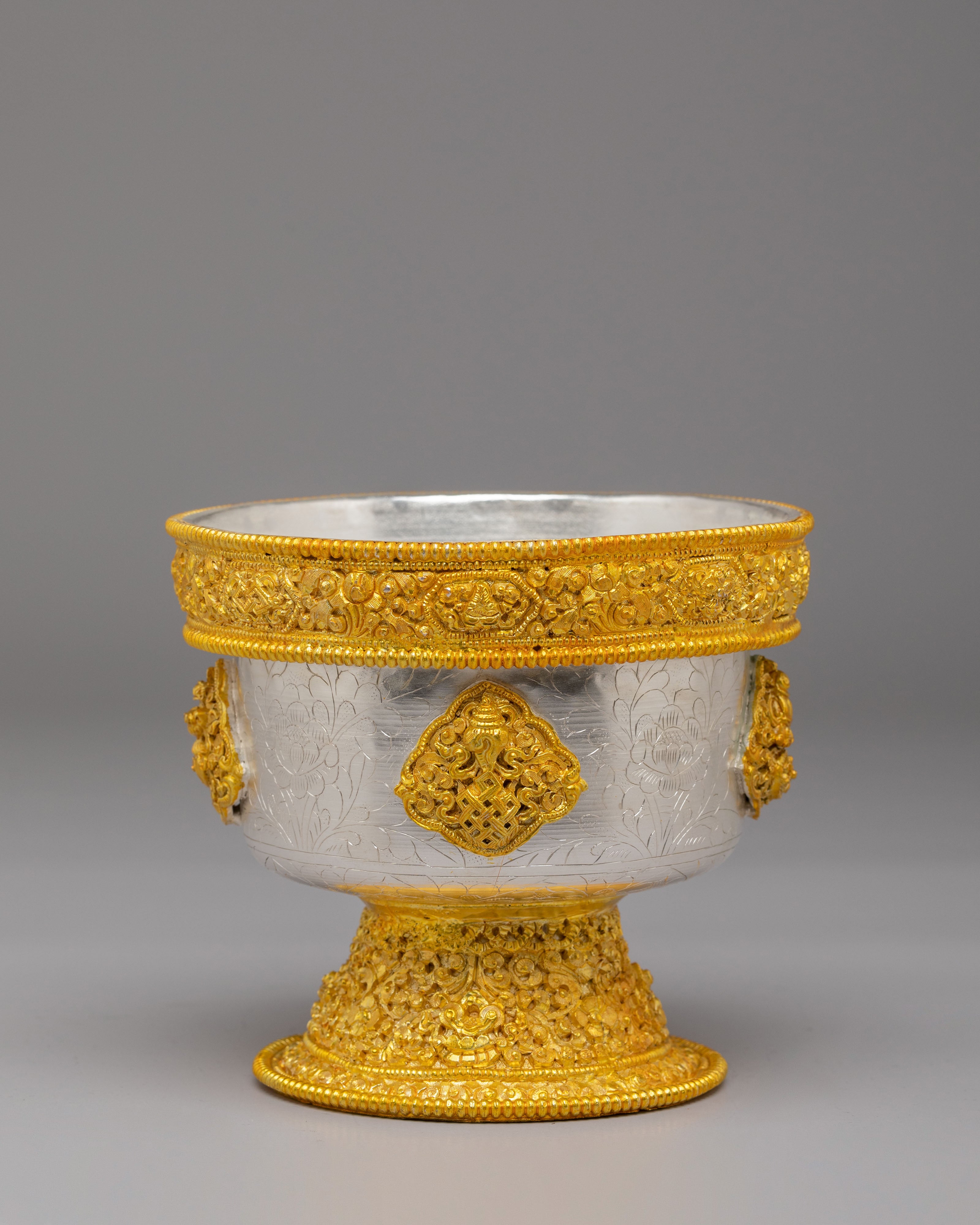 These bowls feature gold and silver plating that enhances their aesthetic beauty, giving them a refined and spiritual appearance. The engraved patterns on the bowls reflect Buddhist motifs, symbolizing abundance, generosity, and devotion. The gold and silver finishes shine with radiant elegance, adding depth to the bowls and creating a meaningful connection to the sacred act of offering and giving.