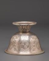 These bowls, which are hand-engraved with intricate Tibetan designs, are both beautiful and hold spiritual significance. Their durability and religious appeal are enhanced by the silver plating, making them ideal for use in temple rituals or on altars. Each bowl weighs about 0.086 kg, and the entire set weighs 0.64 kg. It is lightweight but dependable. This collection represents purity, devotion, and tradition, regardless of whether you are a practitioner or a collector of Himalayan ritual objects.