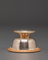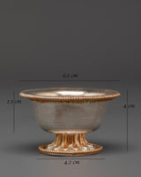 Enhance your sacred place with this magnificent Tibetan Seven Offering Bowl Set, made of copper with delicate silver and electro gold plating. Each bowl is 6.5cm in diameter, 4cm tall, with a base of 4.2cm, and can accommodate offerings up to 2.5cm deep. This complete set, weighing only 0.39 kg, is ideal for everyday ritual use, altar setups, or temple rituals.