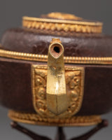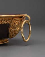 This set includes a beautifully shaped offering pot (10cm H x 14cm base, pot height 7cm, weight 0.34kg), a large plate (5.5cm H x 20.5cm base, 0.46kg), a small plate (1.3cm H x 7.5cm base, 0.026kg), and a decorative stand (6.5cm H x 5.5cm base, 0.086kg). Crafted from copper with oxidized detailing and adorned with 24K gold gilding, the set showcases traditional Tibetan artistry in both form and function. The total combined weight is 1.09kg, giving it a substantial and ceremonial presence.
