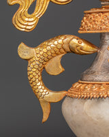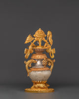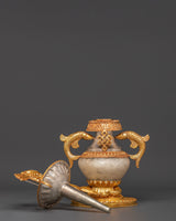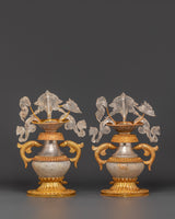 The intricate craftsmanship of these water offering pots showcases traditional Tibetan themes, including the unending knot and lotus blooms. The contrast of gold and silver plating on a solid copper base creates rich visual depth and immortal beauty. The crystal accents intensify their heavenly energy, making them an effective tool for meditation and ceremonial rituals. Each piece holds the ancient Ashtamangala's blessings, which comprise eight auspicious symbols that signify wealth, protection, and spiritual enlightenment.