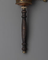 The prayer wheel has a wooden handle that makes it easy to operate and pleasant. The handle combines practicality with a hint of organic elegance by ensuring a smooth rotation during meditation or prayer. This prayer wheel's wooden handle and copper body combine to provide a stunning ornamental accent and a useful tool for spiritual rites. Its exquisite workmanship and design make it a priceless instrument for introspective prayer and a visually arresting addition to any altar or meditation area.