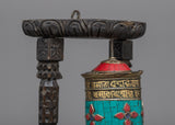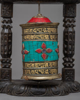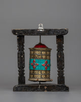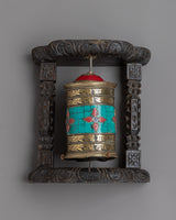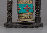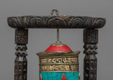 Brass Prayer Wheel on Wooden Frame | Traditional Tibetan Mantra Crafted