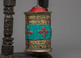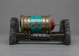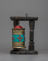 Introducing our Brass Prayer Wheel on a Wooden Frame, a sacred artifact expertly crafted to enhance your spiritual practice. This prayer wheel is handcrafted with precision and has a brass body adorned with artificial turquoise and coral stones. It is set within a wooden frame and stands 21cm tall.