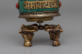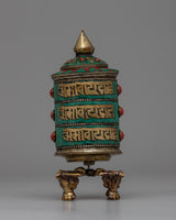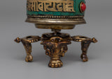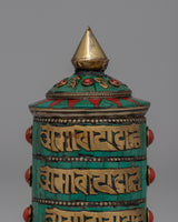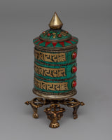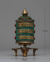 This Buddhist Coral Prayer Wheel is a wonderfully created spiritual object with a durable copper body and a brass base, decorated with artificial coral and lapis lazuli. This prayer wheel is 14 cm tall, 8 cm wide, and weighs 0.174 kg. It is intended to be both useful and symbolic. The rotating prayer wheel, which has traditionally been utilized in Buddhist meditation and rituals, helps to amplify the blessings and mantras written within it, fostering purification and positive energy. The materials used copper for strength, brass for stability, and coral and lapis lazuli for protection, make this an effective tool for both spiritual practice and decorative display.