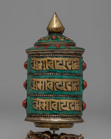 The outer body of the prayer wheel is intricately decorated with coral, which represents energy, protection, and a connection to the ground. The wheel, engraved with sacred Buddhist mantras in ancient Ranjana script, is a potent meditation tool, intensifying the mantras' vibrations with each spin. The brass base serves as a firm foundation, indicating stability in one's spiritual journey. The combination of coral and lapis lazuli heightens the prayer wheel's spiritual importance, as these stones are said to bring protection, wisdom, and healing. This prayer wheel is not only a useful instrument for Buddhist rituals, but it also attracts spiritual benefits and promotes peace, harmony, and cleansing for all who use it.
