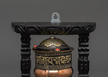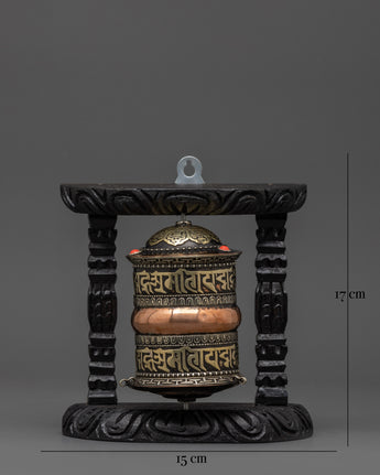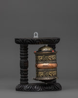 This 0.29 kg prayer wheel, expertly handmade by skilled artisans, spins carefully inside a gorgeously carved wooden frame. It embodies serenity, compassion, and positive energy, making it an ideal choice for Buddhist altars, meditation spaces, or as a meaningful spiritual gift. It is adorned with the potent "Om Mani Padme Hum" mantra.