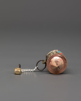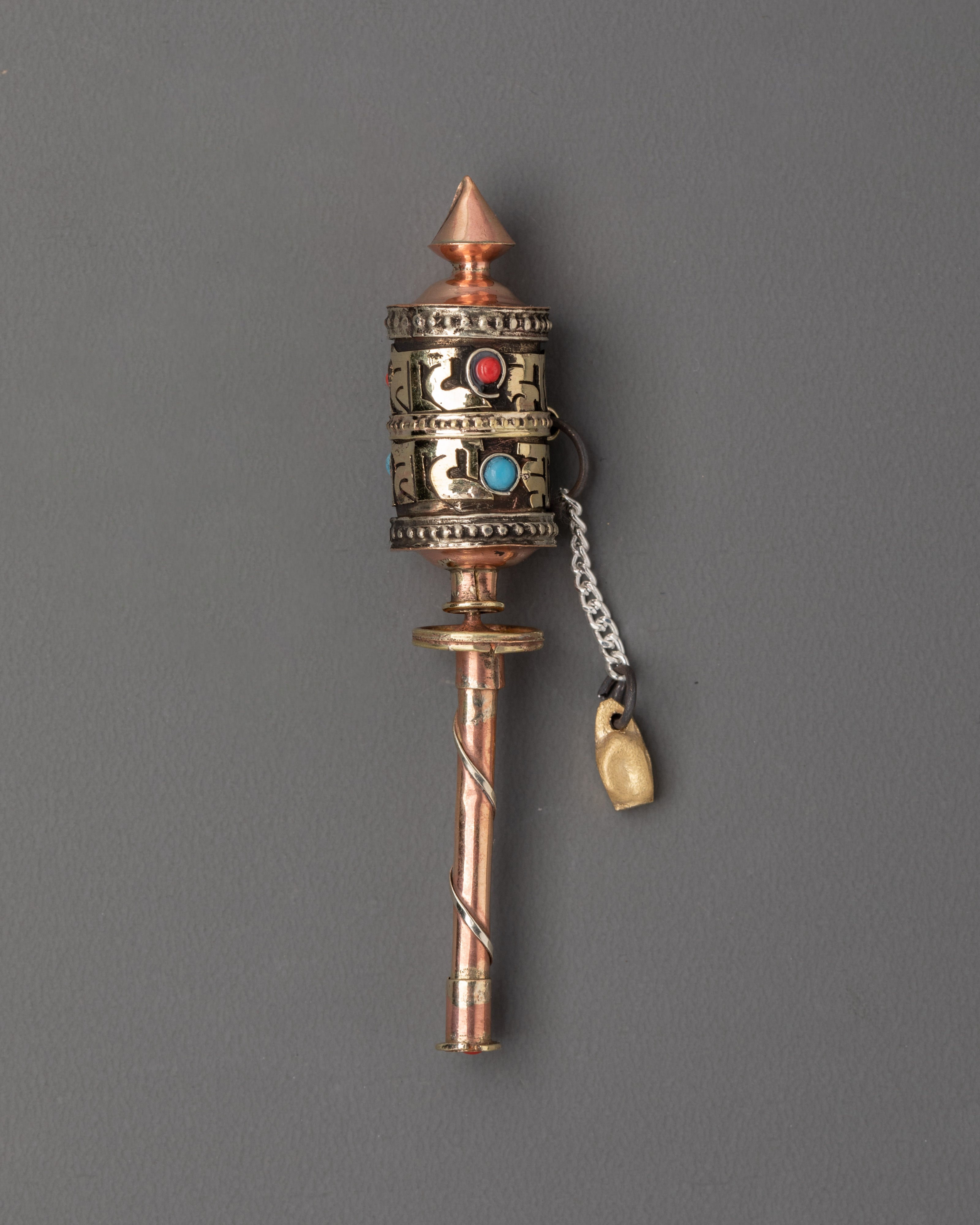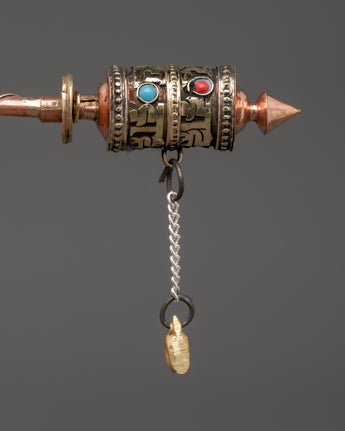Whether you're looking for spiritual decor, a meditation tool, or a thoughtful, mindful gift, this Tibetan spinning wheel is an excellent addition to any sacred environment. The mix of copper, brass, and turquoise stones creates a gorgeous visual item that also brings a sense of serenity and harmony to your surroundings. This prayer wheel is more than just decoration; it's a powerful symbol of spiritual progress and tranquility, making it ideal for meditation practitioners, Buddhist art collectors, and anyone seeking inner calm.