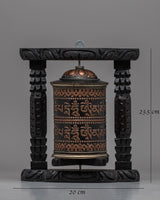 With this elegant traditional Tibetan Buddhist prayer wheel, which is expertly created from a glittering copper body and placed within a beautifully carved wooden frame, you may totally immerse yourself in the spiritual tranquility of the Himalayas. This prayer wheel, which weighs 0.56 kg and has dimensions of 23.5 cm in height by 20 cm in width, is a beautiful combination of form and function that can be used for both meditation and decoration.