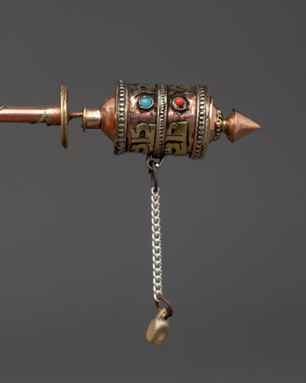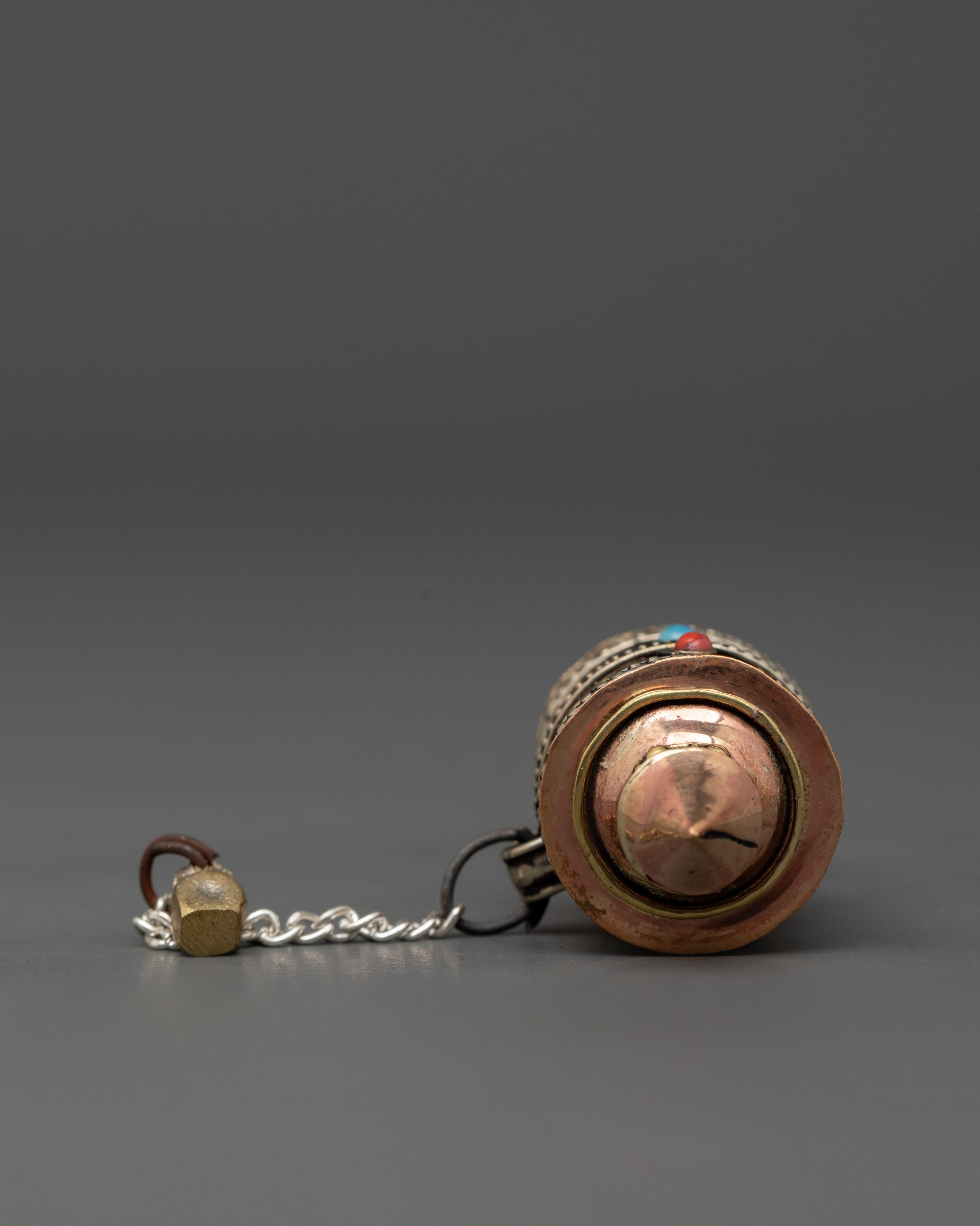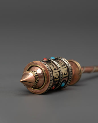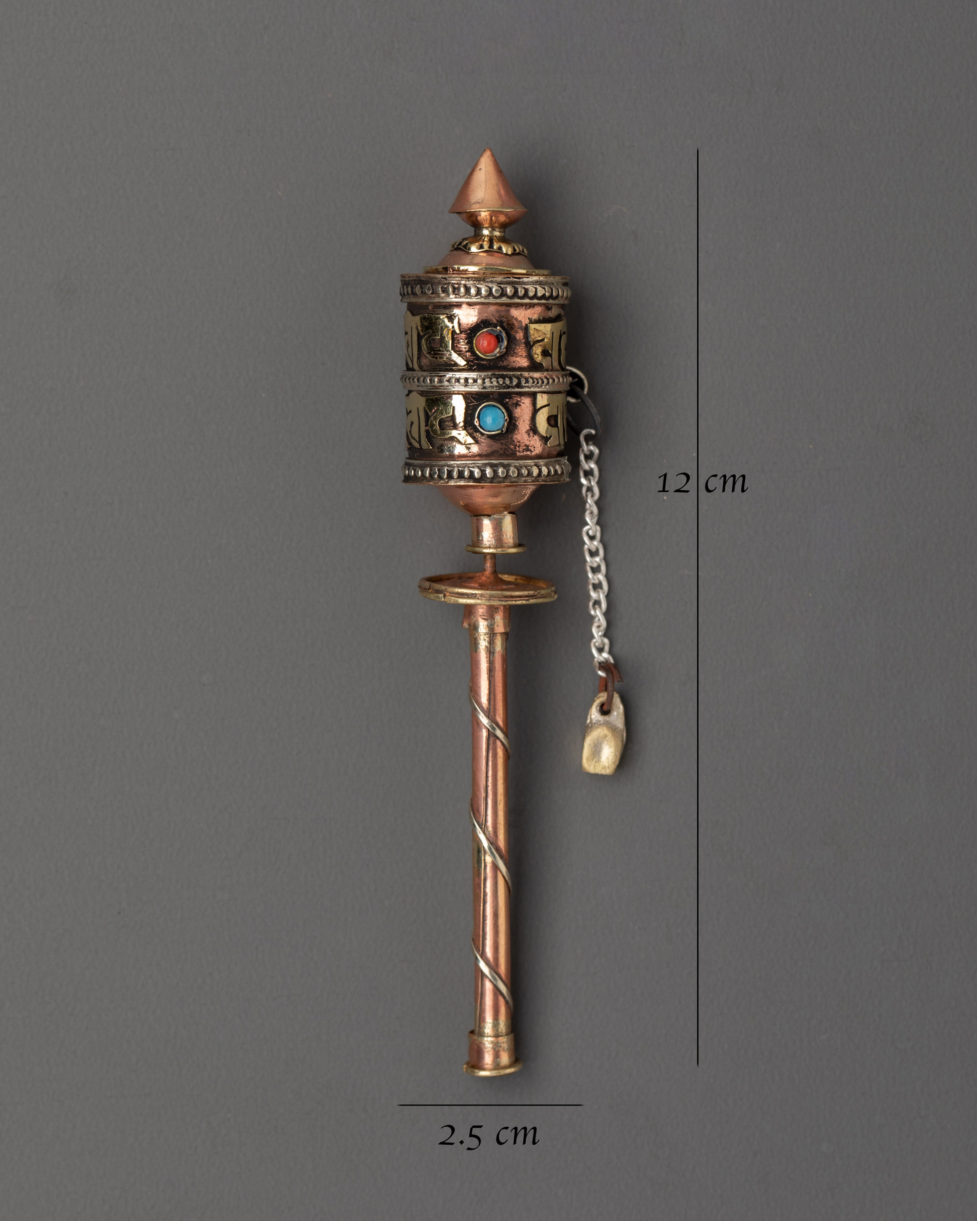 This handcrafted copper and brass Tibetan prayer wheel is a spiritual object with Buddhist roots. Standing 12 cm tall and 2.5 cm broad, this elegant prayer wheel is crafted from beautiful copper with brass details and inlaid with brilliant turquoise stones, enhancing both spiritual energy and visual beauty. This mantra spinner, engraved with the renowned "Om Mani Padme Hum" mantra, is designed to improve your meditation practice, promote inner peace, and support thoughtful rituals with each gentle spin.