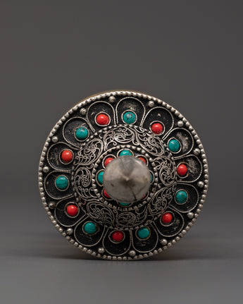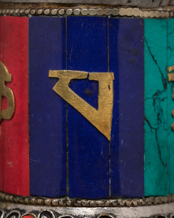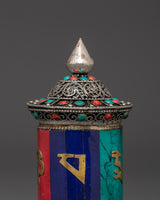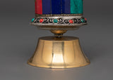 The cylindrical body is inscribed with the spiritual mantra "Om Mani Padme Hum" in gold script, which stands out stunningly against the multicolored panels. A smooth-spinning mechanism enables practitioners to rotate the wheel during mantra recitations or quiet meditations easily. The domed lid has exquisite filigree work and gemstone accents, and its sturdy brass support provides solidity and a shrine.