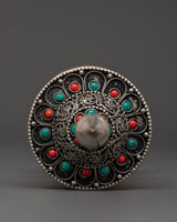 This beautiful handcrafted Mantra Wheel, 13.5cm tall and 6cm broad, is handmade from brass and features bright inlays of coral, turquoise, and lapis lazuli. It weighs 0.158kg, making it both lightweight and durable, ideal for personal altars or holy places.