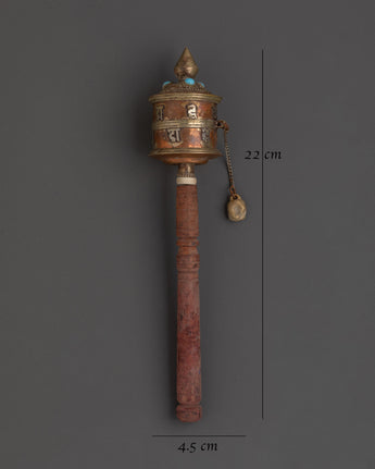 This Handheld Mani Wheel, also known as a Prayer wheel, is a sacred and spiritual instrument that can help you improve your meditation practice and bring calm into your life. Standing 22 cm tall and 4.5 cm wide, it is made of copper, a wooden stick, and turquoise artificial stones. The elaborate pattern is based on ancient Tibetan Buddhist culture, making it an appropriate complement to your home altar or meditation room.