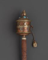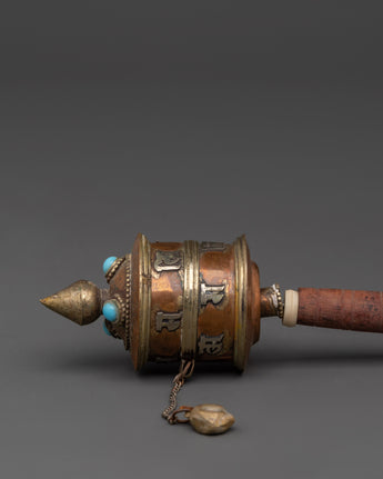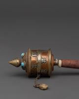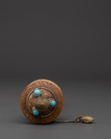 The copper body and wooden stick are precisely balanced for easy usage during meditation, while the turquoise stones represent protection, healing, and power. When you spin the prayer wheel, it is said to amplify your prayers and wishes, allowing positive energy and spiritual benefits to spread around the world.