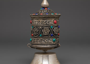 The Handmade Tibetan Prayer Wheel is a sacred artifact designed to enhance your spiritual practice and meditation. This prayer wheel is exquisitely crafted and has elaborate brass work embellished with vivid artificial stones such as coral and turquoise, which represent healing and protection. Standing 16.5 cm tall, this prayer wheel is both a gorgeous addition to your shrine or altar and a powerful tool for chanting and prayer.