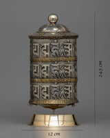Introducing the Mantra Prayer Wheel, a sacred symbol of spiritual devotion meticulously crafted from white metal. Standing proudly at 24.5cm tall, this exquisite prayer wheel is adorned with three rows of meticulously crafted mantras that exude divine blessings and spiritual resonance.