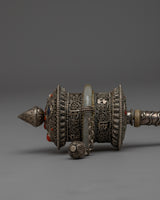 This prayer wheel spinner is an important artifact that reflects fine craftsmanship and profound spiritual values, not just a pretty decoration. The essence of traditional Tibetan art is captured by the combination of jade, silver plating, and copper, which promises longevity and a timeless aesthetic appeal. The profound spiritual meaning and artistic beauty of this prayer wheel enhance any surroundings, whether it is used for personal meditation or placed on a sacred altar. It is a treasured addition to any collection or sacred space, serving as a monument to the rich spiritual and creative tradition of Tibetan Buddhism.