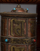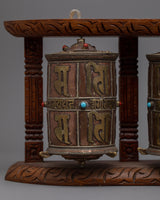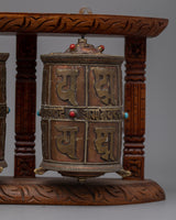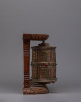 The Buddhist Prayer Wheels are a great decorative item as well as a practical spiritual tool for collectors, art enthusiasts, and spiritual practitioners. This set of prayer wheels encourages meditation and reverence whether placed in a meditation area, on a holy altar, or as a classy accent to any environment. Its appreciated addition to any collection or religious setting is enhanced by the blend of brass and copper, while the wooden mounting provides a touch of traditional elegance. This item is more than just a pretty decoration; it's a significant relic that represents exceptional craftsmanship and profound spiritual principles.