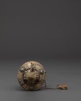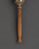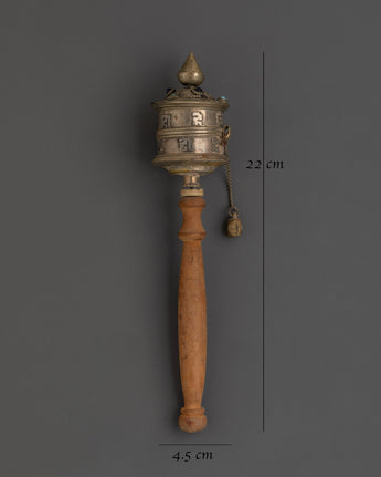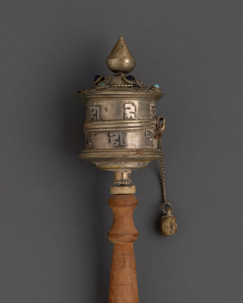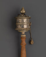 Sacred Buddhist Spinning Mantra Wheel | Wooden Handle, White Metal, and Turquoise Stones