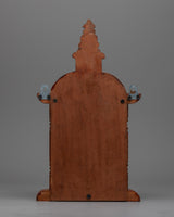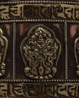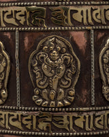 The exquisite handcrafted Tibetan Prayer Wheel Charm is housed in a copper and bronze wooden frame. Its elaborate embellishments perfectly encapsulate the spirit of traditional Tibetan design, and its height of 35.5 cm speaks for itself. In addition to ensuring endurance, the combination of copper and bronze gives the charm a rich, exquisite finish that elevates it above ordinary ornamental items.