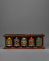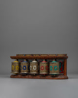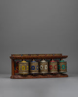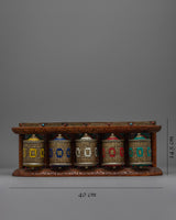 A carefully made spiritual object composed of brass and copper, the Tibetan Prayer Wheel (Wall Mount) embodies traditional Tibetan creativity. This prayer wheel has a remarkable 5-in-1 design that combines multiple prayer wheels into a single, unified piece. It is 14.5 cm in height and 40 cm in width. The mix of brass and copper increases its endurance, giving it a rich, ornamental appearance that emphasizes its spiritual value.