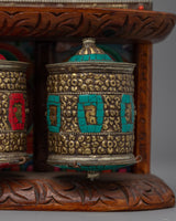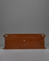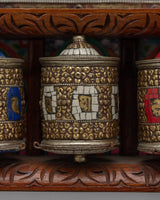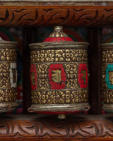 The prayer wheel, which comes with a beautiful wooden frame and is wall-mountable, perfectly complements meditation areas and spiritual shrines. The precise craftsmanship of the metallic wheels is complemented by the strong and visually beautiful hardwood frame. This wall-mounted prayer wheel enhances any sacred area by combining traditional workmanship with useful functionality. It is both a lovely ornamental piece and a useful instrument for spiritual practice.