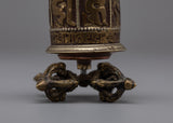 Introducing the Tibetan Praying Wheel, a magnificent handcrafted object that combines the extraordinary artistic skill of Tibetan workmanship with its profound spiritual legacy. This magnificent praying wheel is crafted from fine brass and copper and features a double vajra stand, which represents the endurance and strength of spiritual practice. The exquisite craftsmanship and attention to detail capture the profound cultural and spiritual significance of praying wheels in Tibetan Buddhism, where they are spin to disperse blessings and good energy.