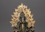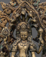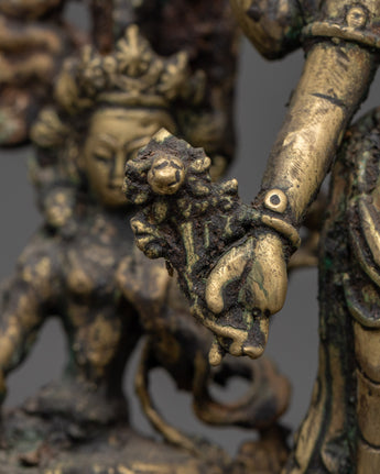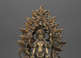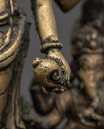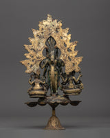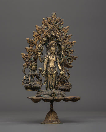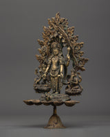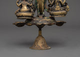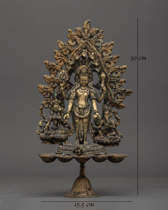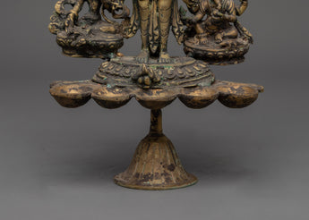 The Brass Oil Lamp features a traditional design with three oil cups that represent the spiritual illumination of the mind. The central figure of Avalokiteshvara, the Bodhisattva of compassion, stands in the center, surrounded by Vasudhara, the goddess of wealth and abundance, and Ganesh, the remover of obstacles. These deities symbolize compassion, prosperity, and spiritual protection, thereby enhancing the lamp’s spiritual significance. The intricate brass work and antique finish add a timeless quality, symbolizing the eternal light of wisdom and the divine energy that guides practitioners on their spiritual journey.