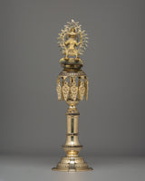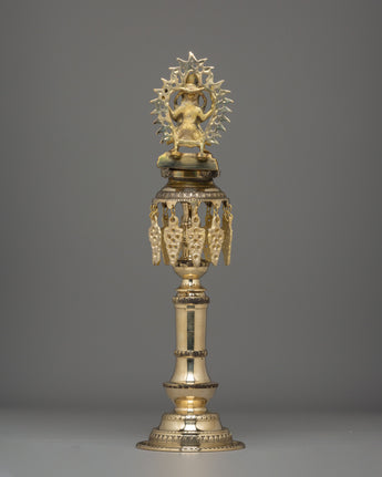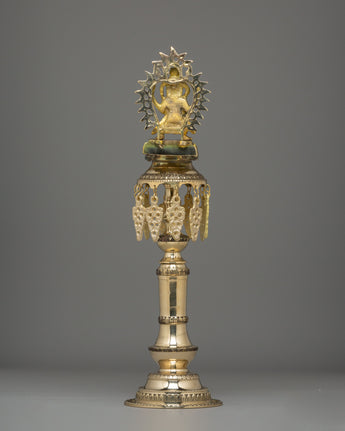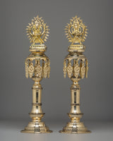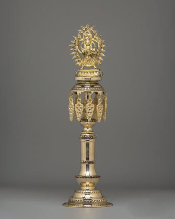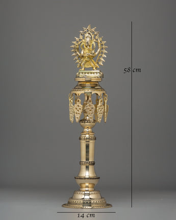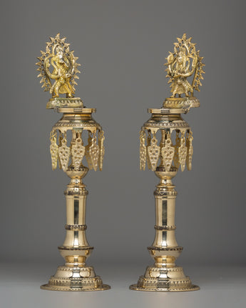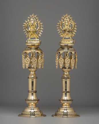 The design showcases exceptional craftsmanship, featuring intricate carvings along the bases, column sections, and the ceremonial crown that supports the deity. The figures, sculpted with expressive detail and traditional attire, represent prosperity, blessings, and the sacred power of illuminated worship. The dangling leaf ornaments echo traditional temple décor, symbolizing spiritual awakening and the flow of positive energy. These lamps are shaped with refined symmetry, giving them a graceful stance that enhances both home altars and religious gatherings.