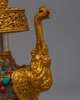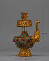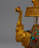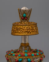 This Bhumba is further adorned with exquisite filigree work, highlighting the careful craftsmanship put into every component. Artificial turquoise with coral stones is included in the set to offer a brilliant splash of color and enhance its visual appeal as spiritual symbolism. This Buddhist Bhumba Set represents an invaluable contribution to any collection since it is a stunning combination of tradition, elegance, and spiritual depth that may be utilized in ceremonies of religion or as a beautiful artifact.