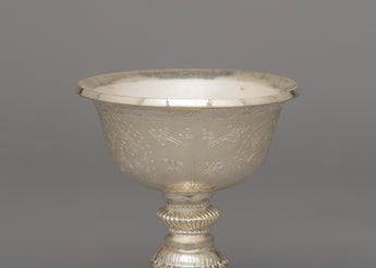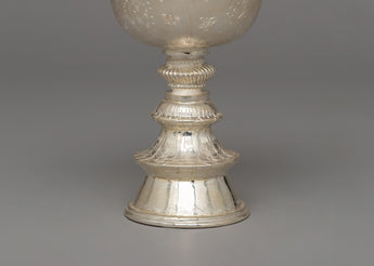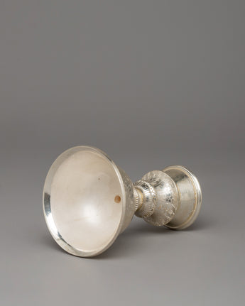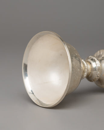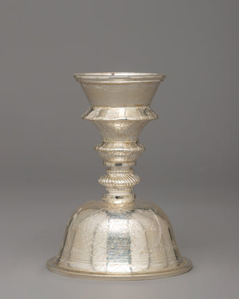 The pure silver's smooth, reflective surface gives this butter lamp a sophisticated and polished appearance. The lamp's aesthetic value is enhanced by the gentle, flowing curves from the stem to the bowl, which feature a minimalist yet intricate design. At only 0.096 kg, this lamp is ideal for altar settings, allowing for easy placement and use in a wide range of sacred spaces. The lamp's design enhances the spiritual ambiance of any room, instilling a sense of reverence and tranquility.