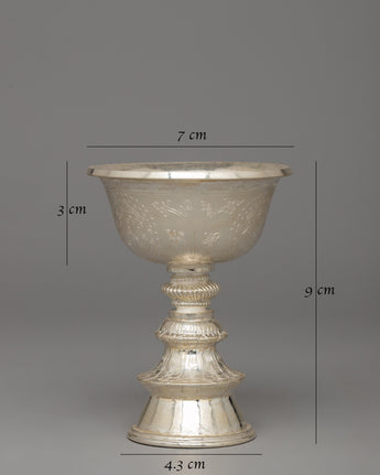 The Pure Silver Butter Lamp is a meticulously crafted religious item commonly used in Buddhist rituals and altar offerings. It stands 9 cm tall and has a base of 4.3 cm. The lamp is designed to be both functional and elegant. The bowl has a diameter of 7 cm and an inner depth of 3 cm, providing plenty of space for holding butter or oil during ceremonial lighting. The finely crafted base and stem provide excellent stability, supporting the lamp's delicate yet sturdy design.