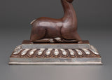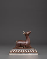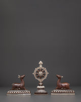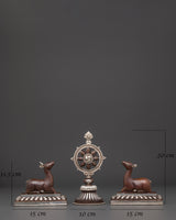 The Dharma Wheel measures 20cm in height and 10cm in width, weighing 0.52kg, while each deer measures 11.5cm in height and 15cm in width, with a combined weight of 1.43kg. The full set weighs 1.95kg. Crafted from oxidized copper with refined silver plating, this altar piece reflects exquisite Himalayan craftsmanship. Its design is deeply spiritual, making it an essential addition to Buddhist rituals, shrine offerings, and meditation spaces.