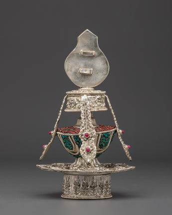 The Handcrafted Copper Life Vase is a remarkable creation made from copper and beautifully embellished with turquoise, ruby, coral, and original stones. Measuring 22 cm in height and 13.5 cm in width, this vase is more than just a decorative item it embodies vitality, protection, and spiritual growth. Rooted in Tibetan ritual tradition, the Life Vase serves as a sacred symbol of life force and the cultivation of positive energies. Its exquisite craftsmanship and meaningful design make it an essential piece for anyone seeking to deepen their spiritual practice or enhance their living space with a powerful, uplifting presence. Elevate your environment and spirit with this unique and inspiring vase.